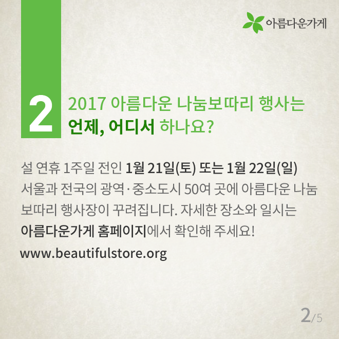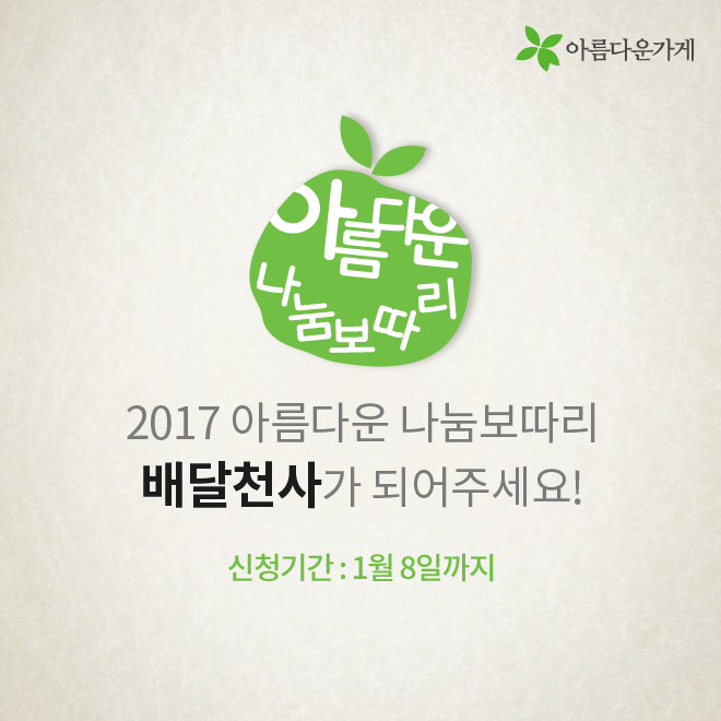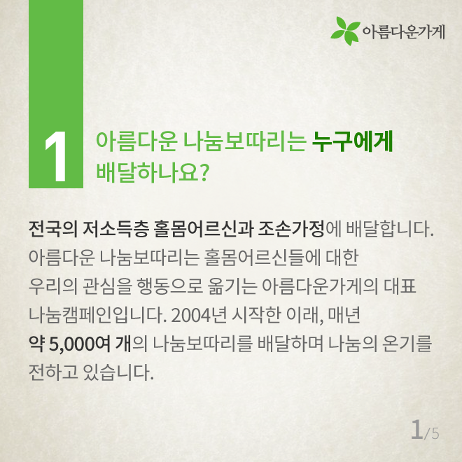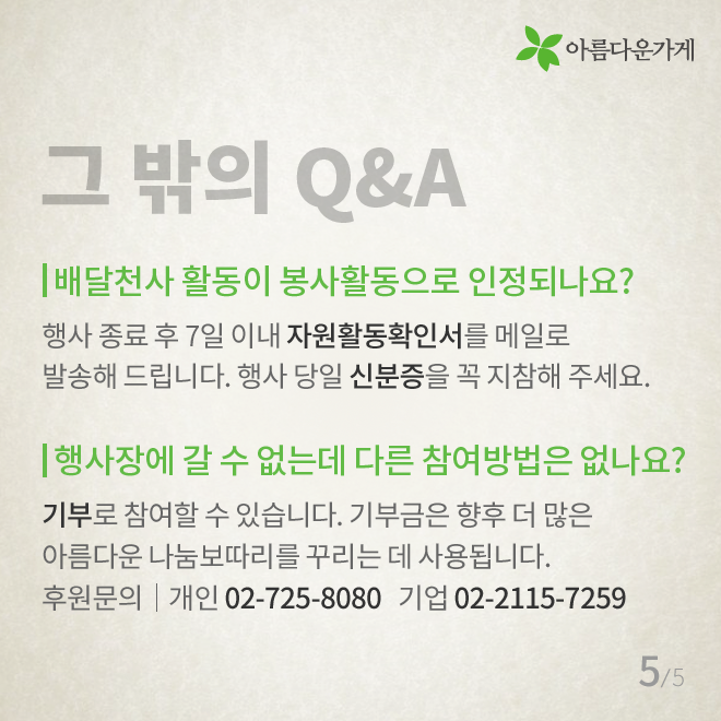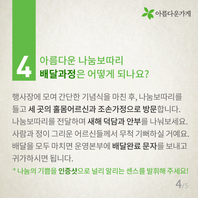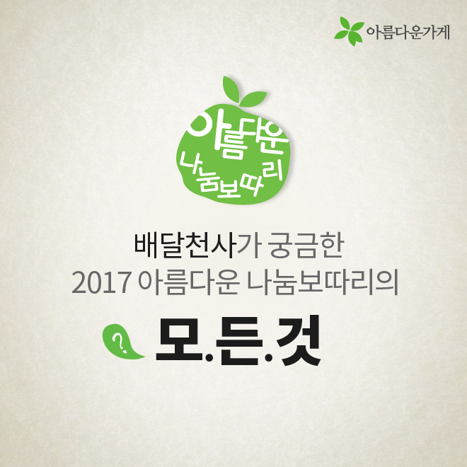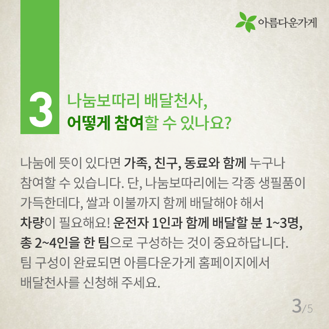[카드뉴스] 배달천사가 궁금한 아름다운 나눔보따리의 모든 것 등록일2016.12.29 조회수1060 아름다운 나눔보따리 배달 봉사에 대해 자주 물으시는 질문들을 모았습니다. 2017 배달천사 신청 바로가기 이전글 숫자로 보는 아름다운가게 2016 2016.12.22 다음글 [카드뉴스] 14년 째 현관문을 두드리는 이유 2017.01.17 목록 함께 보면 좋은 글 have [인턴-뷰] 인턴 업무 일지: 동기님 질문 하나 드려도 되겠습니까? [인턴-뷰] 인턴 업무 일지: 동기님 질문 하나 드려도 되겠습니까? *인턴-뷰(Intern-view)란? 아름다운가게의 ... 2022.02.21 have [아름다운 함께서기-청년 인턴십] 다시 함께한 아름다운가게 [아름다운 함께서기-청년 인턴십] 다시 함께한 아름다운가게 <아름다운 함께서기:청년 인턴십>은 ... 2022.05.09 have 뷰티풀펠로우, 대화의 즐거움 (2016 세 번째 모임) 세상엔 너무 많은 활동들, 사람들, 그리고 일들이 있습니다. 그리고 또한 너무 많은 가치 있는 활동들, 귀중한 ... 2016.10.07 have 뷰티풀펠로우 7기 협약식 현장 공개! 뷰티풀펠로우 7기 협약식 현장을 공개합니다! 지난 2017년 10월 23일 월요일에 뷰티풀펠로우 7기의 협약식이 ... 2017.10.26 have [인턴-뷰] 수료식으로 돌아보는 우리들의 아가 생활…★ [인턴-뷰] 수료식으로 돌아보는 우리들의 아가 생활…★ *인턴-뷰(Intern-view)란? 아름다운가게의 ... 2022.04.21 have 뷰티풀펠로우 심사 현장을 여러분에게 공개합니다~! 여러분 안녕하세요! 오늘은 아름다운가게 뷰티풀펠로우 심사 소식으로 찾아왔습니다~! 뷰티풀펠로우 심사가 ... 2017.09.06