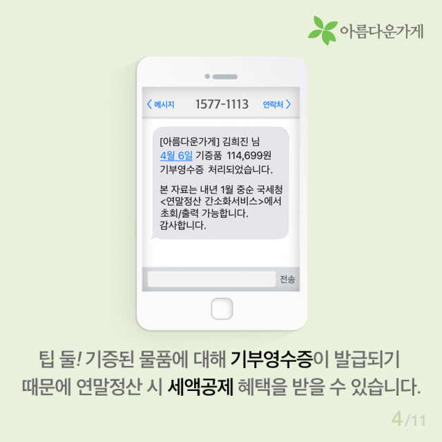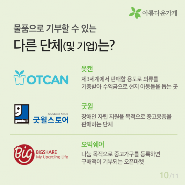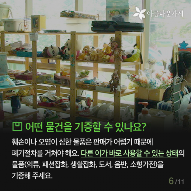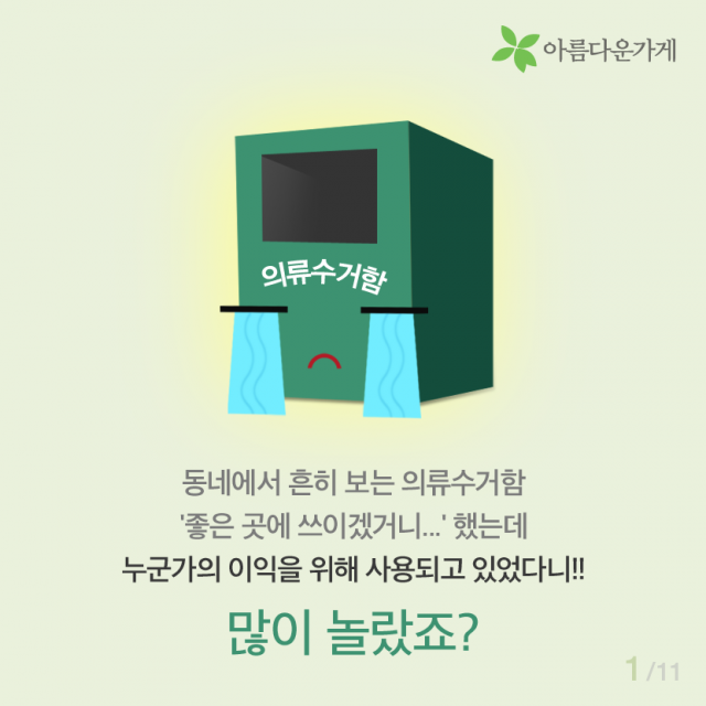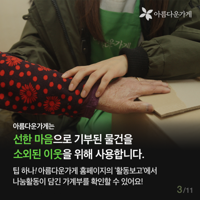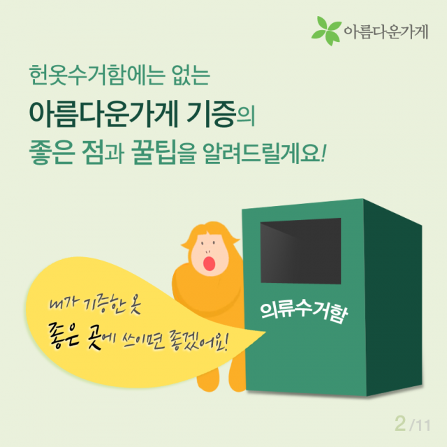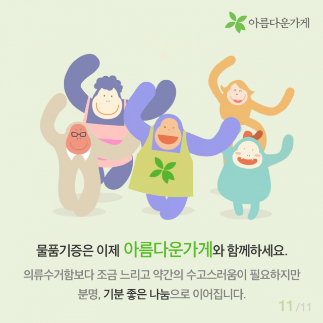 [카드뉴스] 의류수거함에는 없는 아름다운가게 기증의 좋은점 등록일2016.04.12 조회수4224 선한 마음으로 기부된 물품이 우리 이웃을 위해 사용되는 곳, 아름다운가게 물품기증 바로가기 이전글 함께 있으면 좋은 사람, 김하나 간사 2016.02.25 다음글 [카드뉴스] 자원활동, 왜 하시나요? 2016.04.22 목록 함께 보면 좋은 글 have 뷰티풀펠로우, 일상의 somethink (2016, 두번째 분기모임) 바쁘고, 정신없이 흘러가는 일상의 막연한 어떤 것 [SOMETHING]을 꿈꾸시나요? 이번 분기모임은 유동주 ... 2016.06.24 have 아름다운가게에 시각장애인의 접근성을 디자인하다! 뷰티풀펠로우와 함께하는 아름다운가게, 유니버셜 디자인과 만나다 1. 프로젝트의 시작 사회 전반적으로 ... 2016.08.31 have [Beautiful Dream]구민근 펠로우 편 '소유의 공간에서 공유의 공간으로' 페어스페이스(FAIR SPACE)는 도시의 유휴공간을 ... 2016.07.27 have [인턴-뷰]. 우당탕탕 3기 인턴즈의 아.가 적응기 [인턴-뷰] 우당탕탕 3기 인턴즈의 아.가 적응기 *인턴-뷰(Intern-view)란? 아름다운가게의 인턴(Intern)과 ... 2022.02.03 have 샘물자리 “제일 유명하지는 않지만, 제일 맛있습니다” 착한 생산자 이야기 여덟 번째 “제일 유명하지는 않지만, 제일 맛있습니다” 샘물자리 이번에도 가게 ... 2017.07.25 have [아름다운 함께서기-청년 인턴십] 다시 함께한 아름다운가게 [아름다운 함께서기-청년 인턴십] 다시 함께한 아름다운가게 <아름다운 함께서기:청년 인턴십>은 ... 2022.05.09