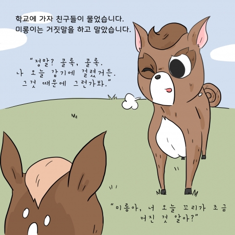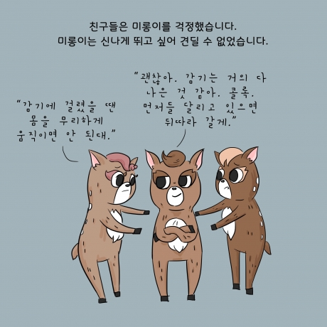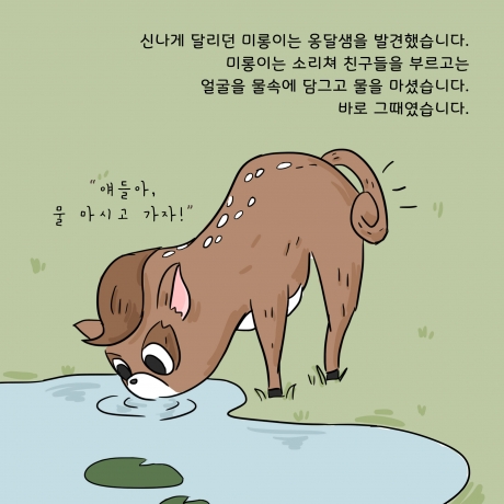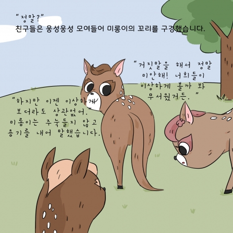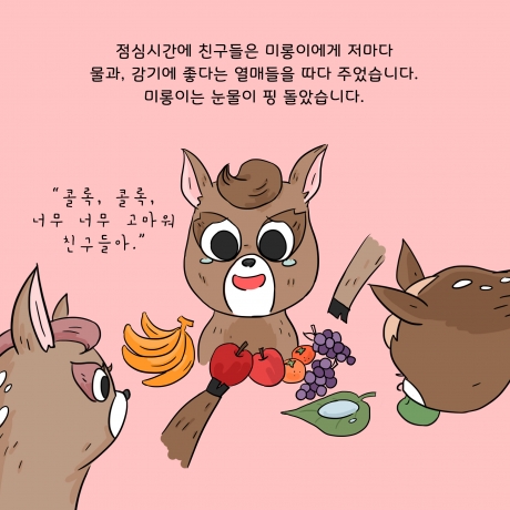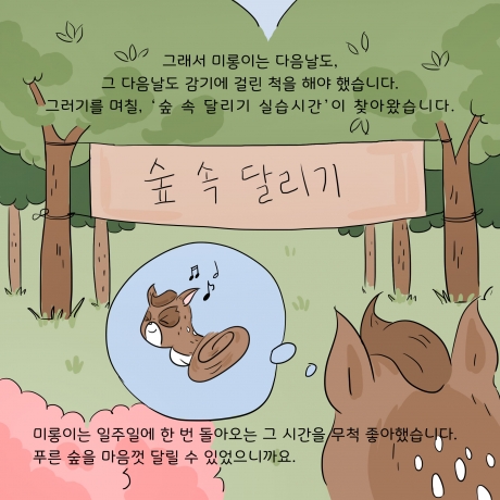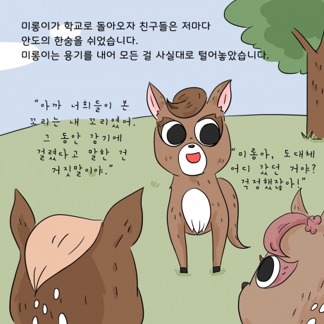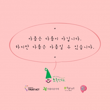 아름다운가게와 사노피가 함께 '초록산타 캠페인'의 시작을 알리며 제작한 카드툰입니다. 신체적 아픔을 겪는 환아들이 질환에 대한 두려움을 극복하고 일상생활에서 정서적으로 보다 건강하게 성장할 수 있도록 편견을 깨는 것. 그렇게 될 수 있도록 ‘다름’에 대해 생각해볼 수 있는 '사슴 미롱이의 이야기'. 아이들이 마주한 편견과 다름을 바라보는 우리의 시선을 다시 한번 생각해 볼 수 있겠죠?