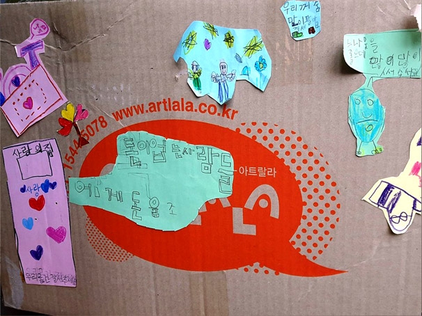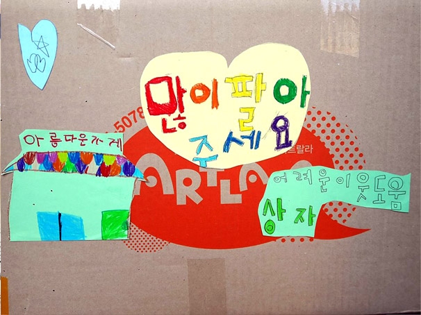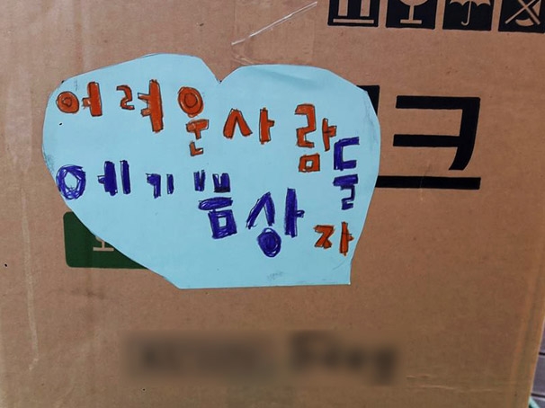 ‘어려운 이웃 도움 상자’라고 쓰인 기증 박스. 아름다운가게에서 기증 박스를 수거하러 간 날 박스를 보고 한참 웃다가 울다가하며 오만가지 감정이 교차하셨다는 수거 간사님. 기증 박스를 버릴 수도 뜯을 수도 없었던 날이었습니다. 상자를 찬찬히 봐주세요! 정말 메시지가 기가 막혀 한참을 보고 또 보며 웃음이 납니다. 어린 기증천사 님에게도 힘을 얻습니다.
