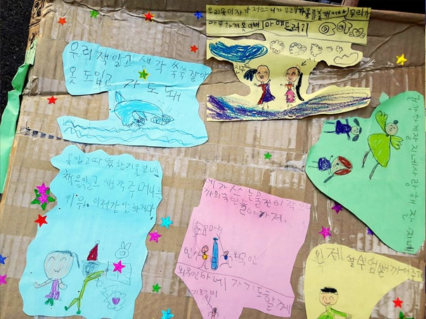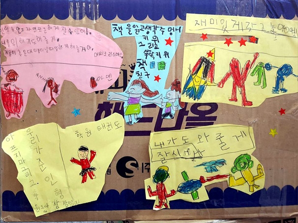 한 초등학교에서 친구들과 기증품을 모았다는 연락을 받고 달려갔습니다. 그리고 큰 기증 박스들 위에 곱게 놓인 메모. 보자마자 감동의 물결이! 아침부터 너무너무 힘이 됩니다. 여러분의 기증품을 좋은 곳에 아름답게 쓰이도록 할게요. 고마워요. 친구들!